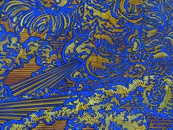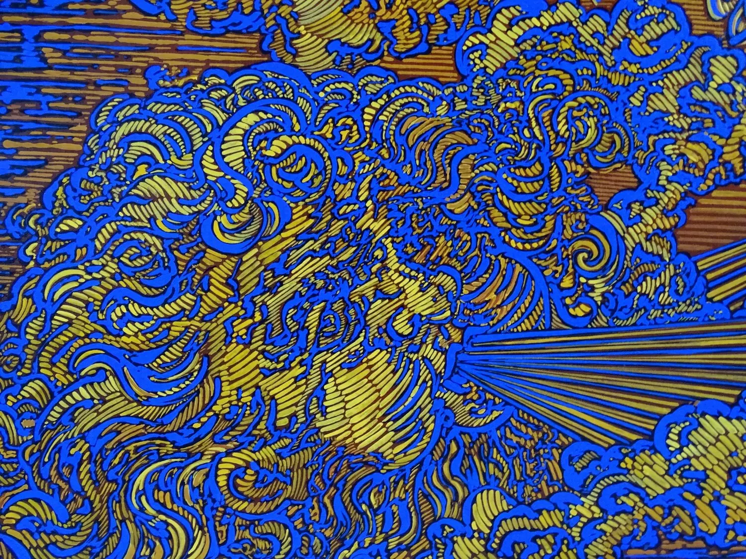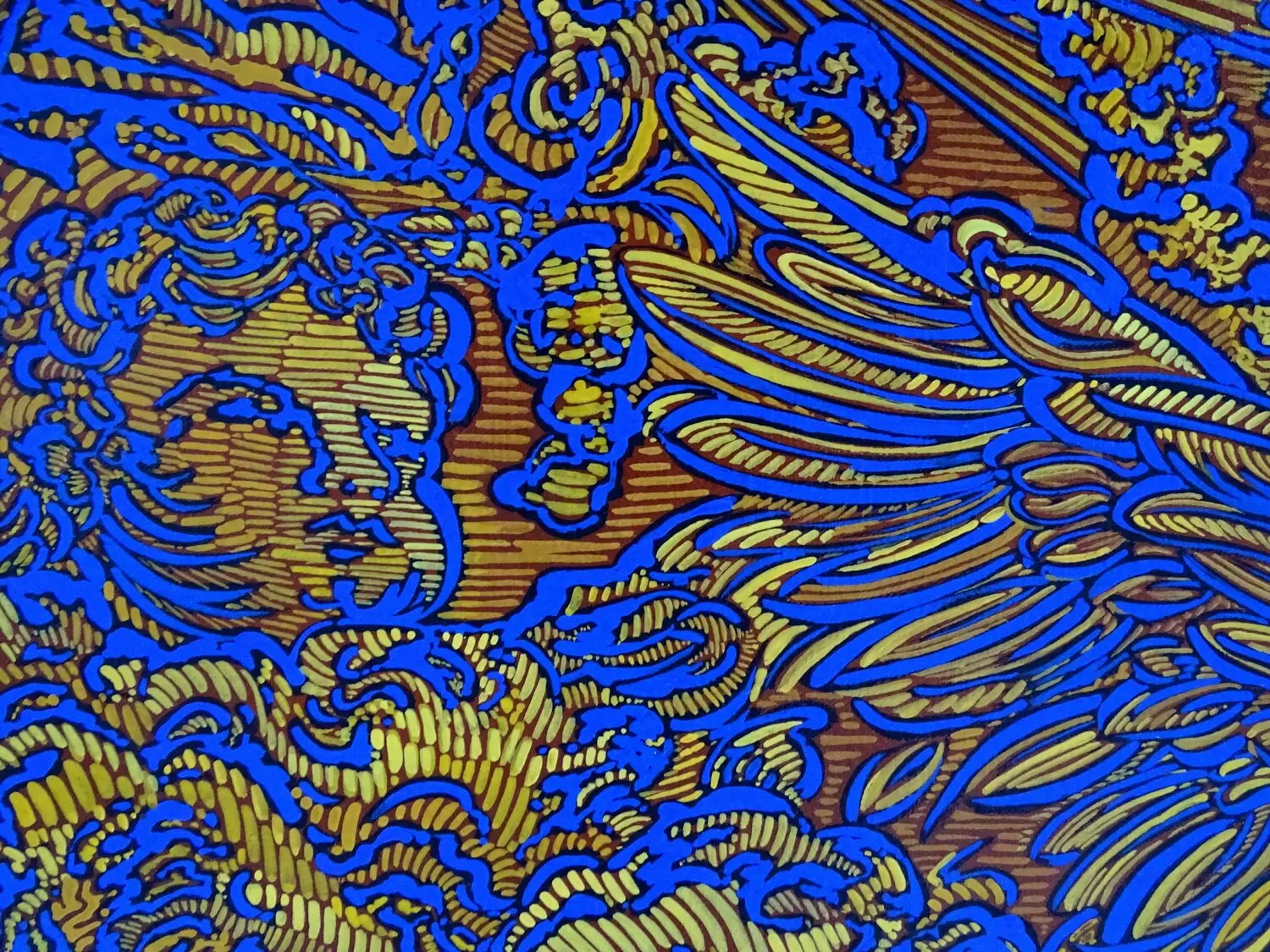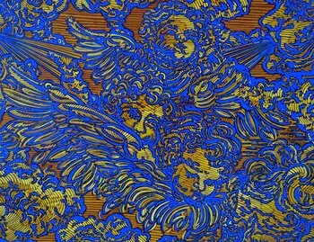 This painting, with powerful contrasts of yellow and blue, evokes breath, life, energy and movement. The breath carries, transports, moves, invites, makes possible… It is at the origin of the transformations. Here, four baroque angels, little eros, carried by the four Greek winds, Sephyr, Boreas, Notos and Euros, play in the lightness of aerial whirlwinds. They silently flap their wings, puffing out their cheeks to disperse the clouds, in a maelstrom…