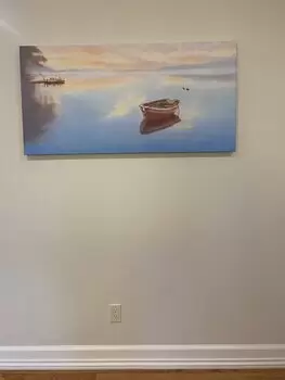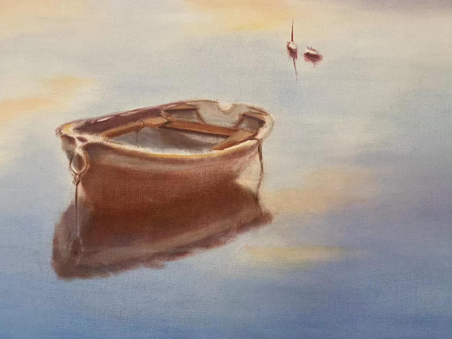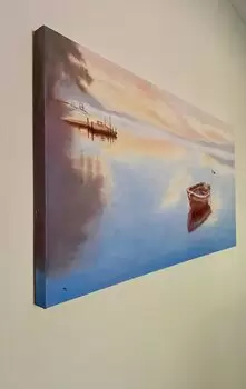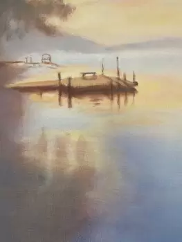 This scene on Cayuga Lake inspired me to capture the stillness and quiet beauty of early morning. The glowing effect comes from transparent washes of color that blend into the soft sky and mirrored reflections on the water. A rustic, simply styled boat floats serenely, emphasizing the calm and uncomplicated spirit of the scene. The overall simplicity mirrors the gentle awakening of the lake at first light.