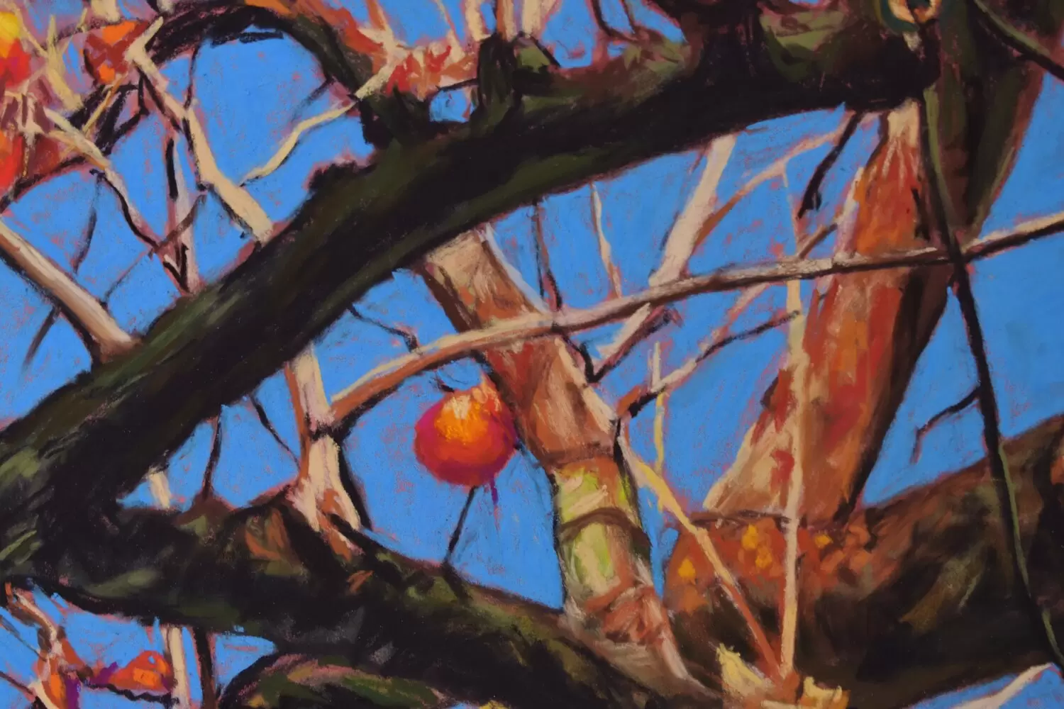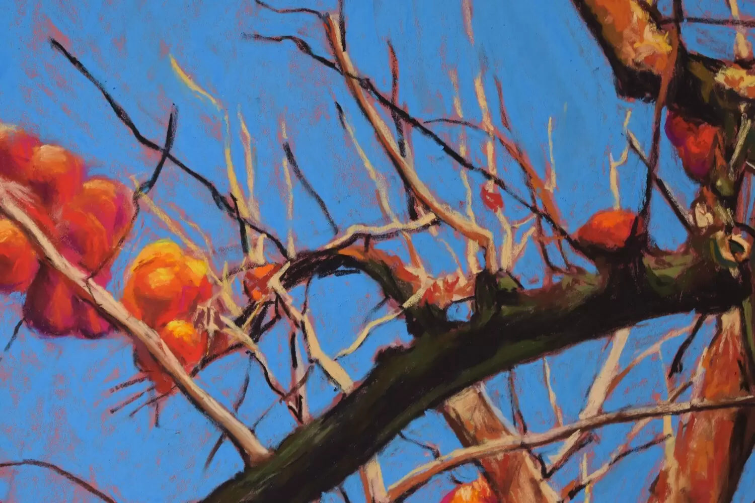 I captured the vibrant energy of a persimmon tree reaching toward the sky, blending impressionism’s fluidity with realism’s detail. The bright orange fruits pop against the intense blue, evoking warmth and hope. This pastel painting invites you to feel nature’s resilience and the joy of autumn’s fleeting beauty, filling your space with uplifting, natural vitality.