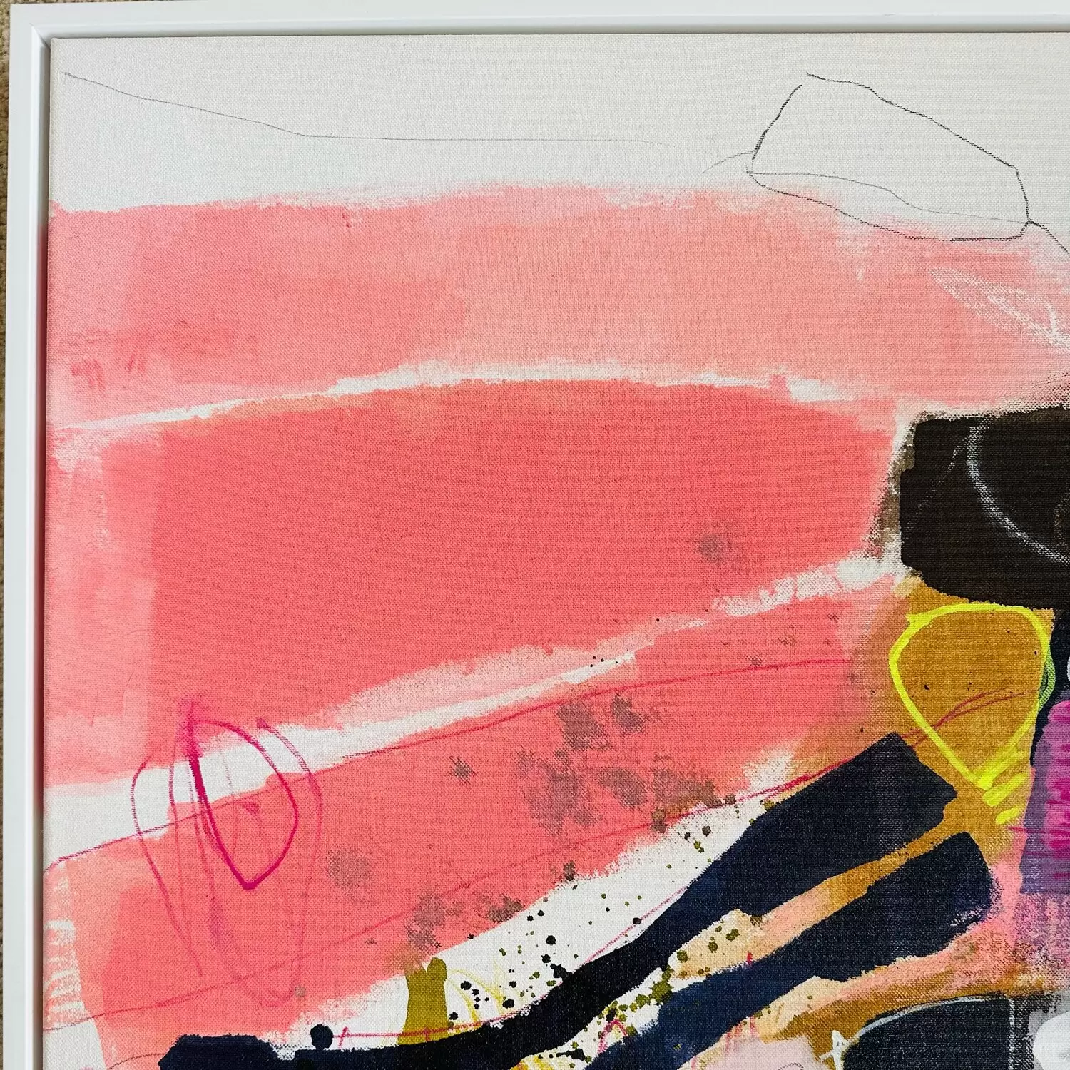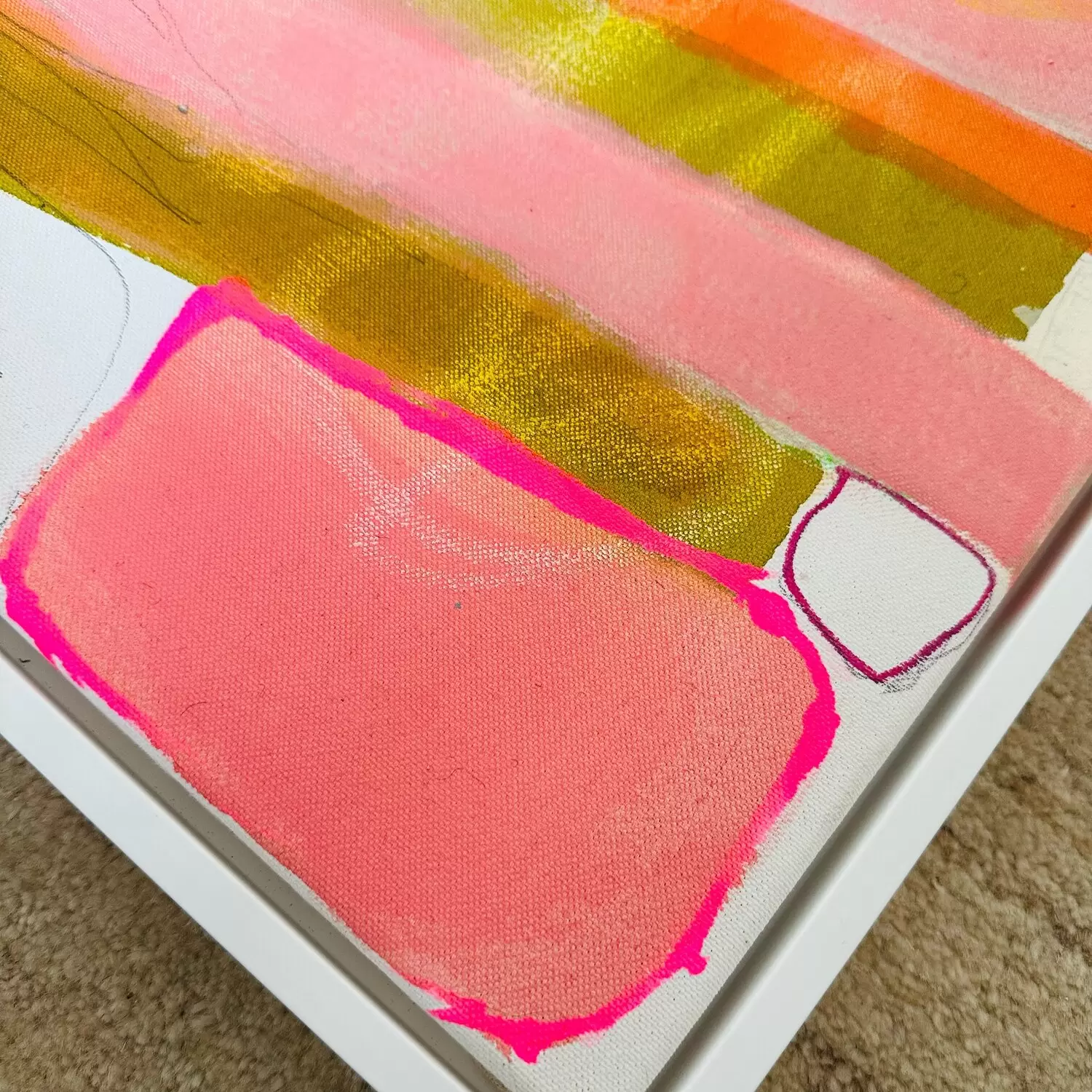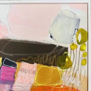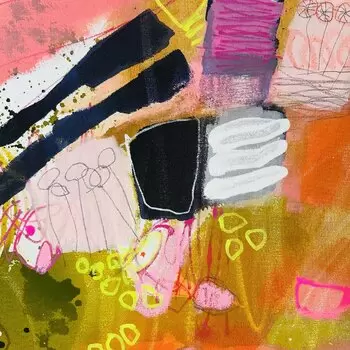 This abstract work from the Lost in Time series unfolds a light, poetic color world in delicate pastel shades: light pink, vibrant orange, lime green, and accents of bright yellow. The composition is animated by floating abstract ornaments, rounded circles, lines, and square borders reminiscent of floral ornamentation without being representational. With fine details in pink acrylic pen, I deliberately created contrasts and highlights, while the…